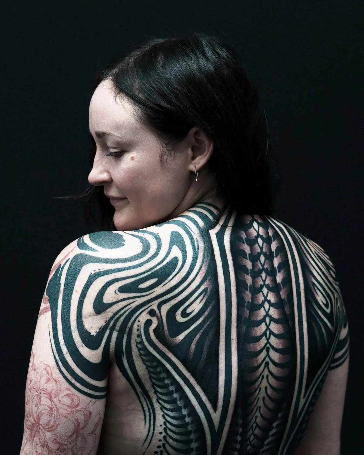 Josaline Green’s tattoos could come from worlds a thousand years in the future to eons past. She specializes in cyberpunk, neotribal and geometric tattoos that are designed to interact with individual anatomy and provide a new perspective on the way we view movement in the human form.